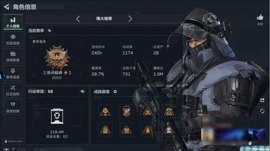 总资产9M 2干员外观 1近战 21传说枪械 烽火:三角洲巅峰 战场:...¥1000.00
