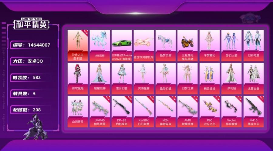 【特价出售】钱包无法注销 安卓Q-1红装5载具13粉装12特效枪17热门159套装208枪皮 88070热力值 10印记 历史超级王牌13星 【1红装】 沙丘之主-图卡盟 (4级) 【5载具】 兰博SVJ绿色 冰绡玉鳞 晶梦灵驹 盛世惊鸿摩托车 鬼马风驰 【13粉装】 梦幻火箭 萨利娅 绯穹魔姬 雪月幻音 荧海星豚 羊梦糖心 幻梦之森 智耀战神 晶梦幻蝶 精灵娃娃 幻彩电音 冰霜白皇 山涧鹿灵 【12特效枪】 M416-心之恋语 (1级) M416-墨龙九天 (1级) M416-灵猫魔法师 (9级) P90-沙丘之主 (3级) Kar98K-圣域龙灵 (1级) Kar98K-巳巳如意 (5级) Vector-绯穹魔姬 (3级) DP-28-豹影疾电 (5级) 蜜獾-荧海星豚 (2级) AMR-智耀战神 (3级) M24-镜域双华 (3级) UMP45-相思残雪 (7级) 【17热门】 小丑鱼 六号稻草人 雪山精英 晶辉守护 梦魇先生 梦起落英 神秘黑猫 团圆交子 瑞龙福将 纯白誓言 豚鼠丹丹 梦之呓语 影双刃 破蛋小黄鸡 极速红龙 M762-瑞龙福将 汤姆逊-林间仙鹿 【4飞行器】 龙翔九天飞行器 梦幻火箭飞行器 诡面斩飞行器 太空嘟嘟飞行器 【3头盔】 梦幻火箭头盔 甜蜜誓约头盔 夏日绵绵冰头盔 【1背包】 神秘黑猫背包